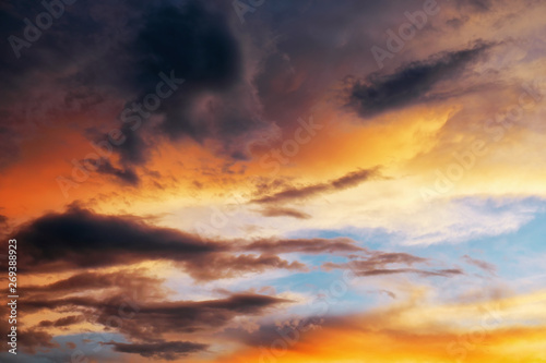 © es0lex, Fototapeta premium Beautiful dark fluffy cloudy sky. Sunset light.