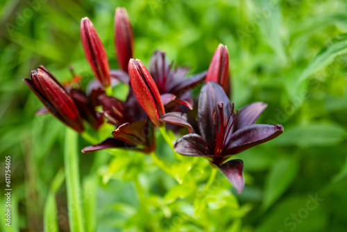 Fototapeta premium Beautiful dark red lily flowers on sunny summer evening.