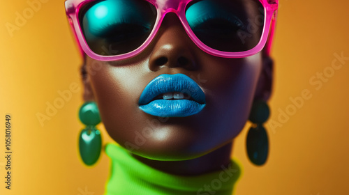 Fototapeta premium Beautiful dark-skinned woman model in sunglasses on isolated background. Close-up of model's face with bright makeup and blue lipstick.