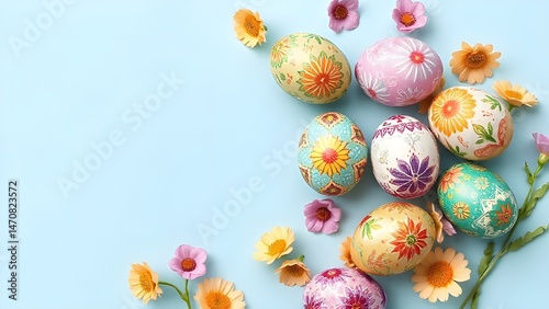 © JohnLee, Fototapeta premium Beautiful decorated Easter eggs on light blue background, flat lay. Space for text