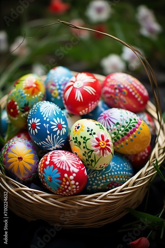 Fototapeta premium beautiful decorated eggs in the basket on Easter day