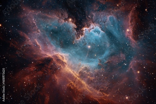 © Azadart, Fototapeta premium Beautiful deep space nebulosity with stars in Cassiopeia showing cosmic gas clouds and stellar formation regions, with deep blues and reds on black background