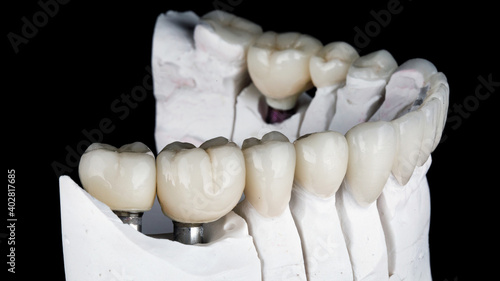 Obraz premium beautiful dental crowns and ceramic veneers on the model, filmed on a black...