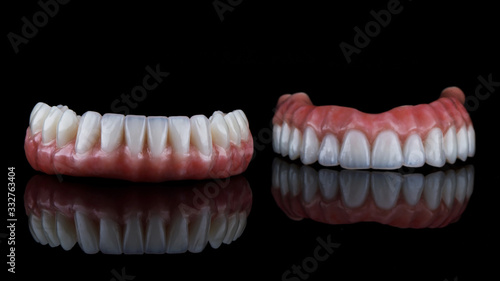 © Dental Pro Content, Fototapeta premium beautiful dental prosthesis for the lower jaw in the foreground, shot on a black background with reflection