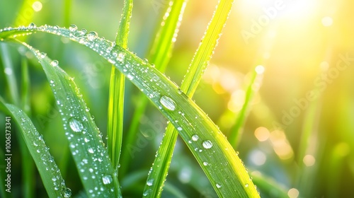 Naklejka premium Beautiful dew drops on the grass leaf, close-up, macro photography, green...