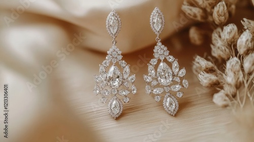 © Sampao, Fototapeta premium Beautiful diamond earrings with intricate patterns placed on a light wooden surface and neutral beige background.