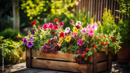 © May, Fototapeta premium Beautiful different color flowers in pots on wooden pallet