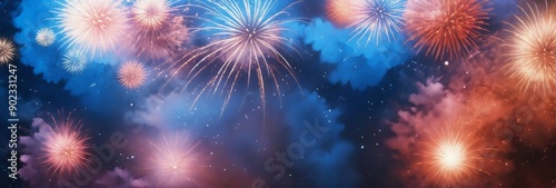 Fototapeta premium Beautiful display fireworks night sky background filled vibrant