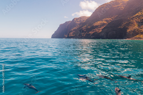 Obraz premium Beautiful dolphins swimming in the waves by the Na Pali cliffs near Kauai island. Hawaii Pacific Ocean wildlife scenery. Marine animals in natural habitat.