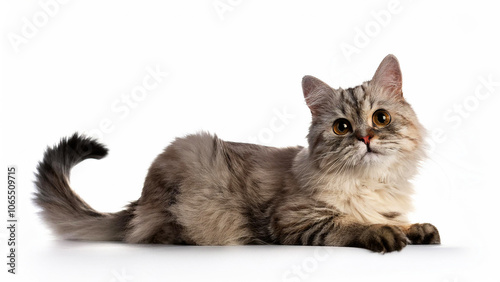 © Sonya, Obraz premium Beautiful domestic young cat lies on white background.