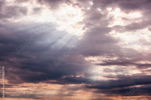 Obraz premium Beautiful dramatic sunset cloudy sky with sun rays. Natural background and texture, abstract image