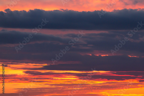 Fototapeta premium Beautiful dramatic sunset orange sky with blue violet clouds