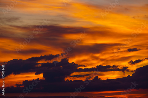 Obraz premium beautiful dramatic sunset sky, bright sunlight and dark silhouette of clouds...