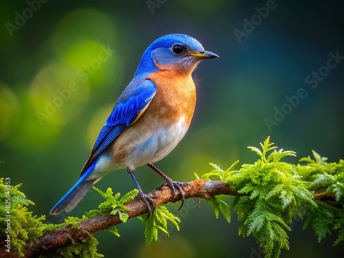 © Four888, Fototapeta premium Beautiful Eastern Bluebird Perched on a Branch in the Lush Greenery of Missouri's Natural Habitat