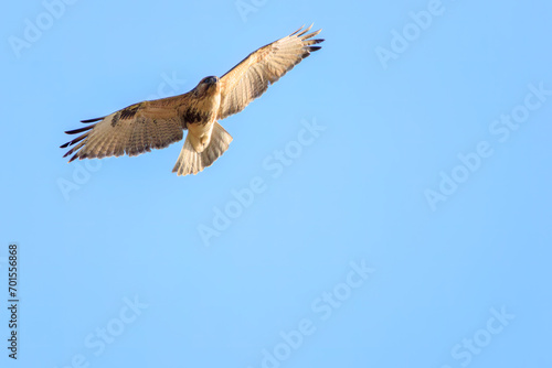 Obraz premium 飛翔する美しいノスリ(タカ科)。日本国埼玉県北葛飾郡、まつぶし緑の丘公園にて。 2023年12月30日撮影。Beautiful Eastern Buzzard (Buteo japonicus, family comprising hawks) in flight.At Matsubushi midorinooka park, Kitakatsushika-gun, Saitama,