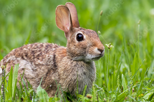 © rabbitti, Fototapeta premium Beautiful Eastern Cottontail Rabbit, Sylvilagus floridanus, in lush green morning grass