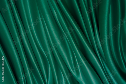 © Sindija, Fototapeta premium Beautiful elegant wavy dark green satin silk luxury cloth fabric with monochrome background design. Wallpaper, banner. Copy space.