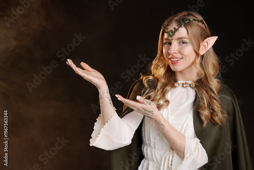 Obraz premium Beautiful elf girl on black background with smoke, space for text