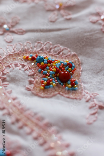© gabriela, Obraz premium Beautiful embroidery on a pink fabric. Close-up.