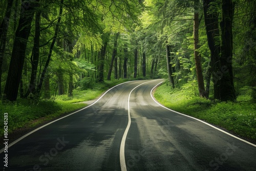 Fototapeta premium Beautiful empty asphalt road in a green forest. AI generative