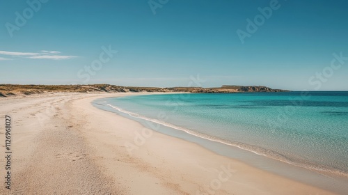 © KYR, Obraz premium Beautiful empty beach with vivid turquoise waters meeting a soft sandy shoreline under a bright, cloudless sky.