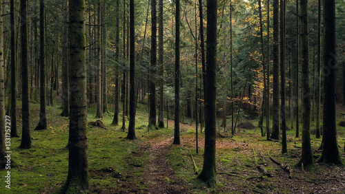 © robsonphoto, Obraz premium Beautiful empty path in mossy tree forest landscape.