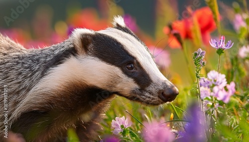 © Jamal, Obraz premium Beautiful European Badger Meles Meles Eurasian Badger In His Natural Environment In The Summer Meadow With Many Flowers