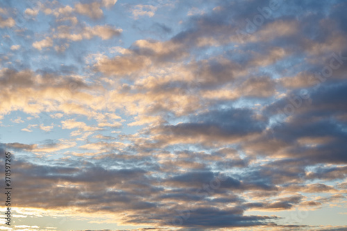 Fototapeta premium Beautiful evening blue sky at sunset with flaming bright light clouds. A warm summer evening at sunset.