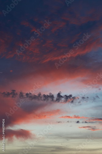 © nikolay_alekhin, Naklejka premium Beautiful evening blue sky at sunset with flaming bright light clouds. A warm summer evening at sunset. Bright sunset.