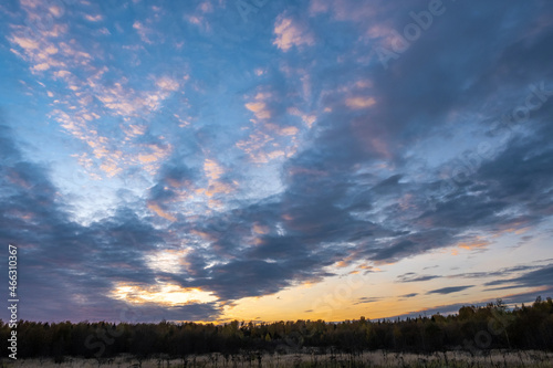 Fototapeta premium Beautiful evening cloudy sky with the tops of autumn trees.