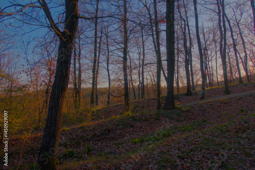 Obraz premium Beautiful evening forest bathed in warm orange sunlight with long tree...