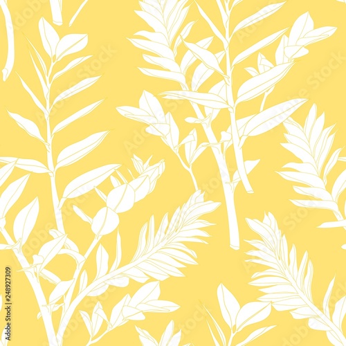 © Iuliia, Obraz premium Beautiful exotic Zamioculcas Leaf Silhouette Seamless Pattern Background. Illustration EPS10. Yellow background.