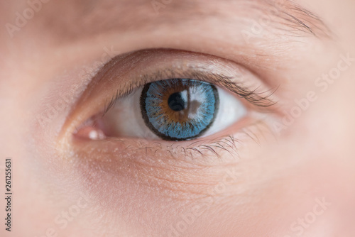 © Oksana Bessonova, Obraz premium Beautiful eye in blue soft contact lens close up macro