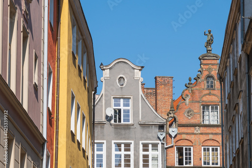 Naklejka premium Beautiful facades of historical buildings in the Old Town. Narrow streets. Gdansk, Poland. Architecture details.