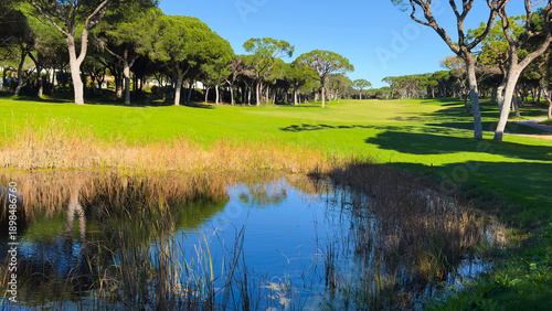 Fototapeta premium Beautiful Fairway At Golf Course. Artificial lake in golf course with...
