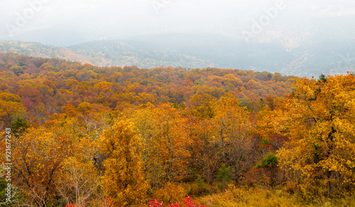 © Jeffrey, Fototapeta premium Beautiful fall colors on the mountain with heavy fog down in the valley.