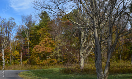 © JudithAnne, Fototapeta premium Beautiful Fall Trees on the Edge of the Forest Next to a Country Road