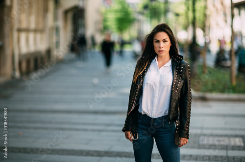 © Etoilestars, Fototapeta premium Beautiful fashion model in black leather jacket posing outdoor.