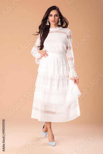 Fototapeta premium Beautiful fashionable woman well dressed, handbag and accessories. Fashion spring summer photo. Lace dress