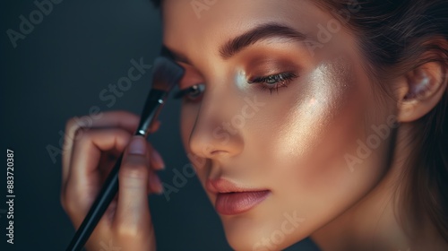 © best stock, Obraz premium Beautiful female eyes with bright blue make-up and brush