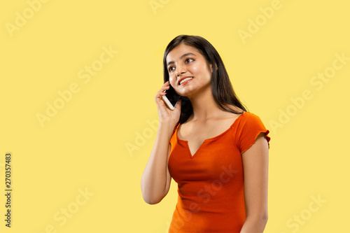 © master1305, Fototapeta premium Beautiful female half-length portrait isolated on yellow studio background. Young emotional indian woman in dress talking on the phone. Negative space. Facial expression, human emotions concept.