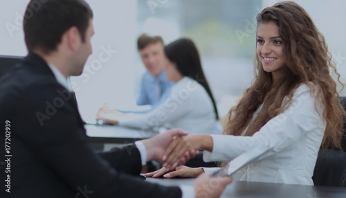 Fototapeta premium beautiful female Manager shaking hands with a client at the work