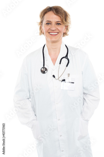 © stockyimages, Fototapeta premium Beautiful female physician in white uniform