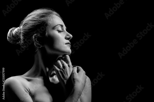 © tugolukof, Obraz premium beautiful female profile with bare shoulders on black background with copy space, monochrome