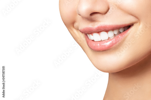 Obraz premium Beautiful female smile after teeth whitening procedure. Dental care....