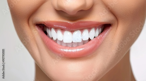 © Login, Obraz premium Beautiful female smile with healthy teeth. Close-up teeth after whitening procedure. Dentistry concept. Image symbolizes oral care dentistry. Can be used for advertising, marketing or presentation.