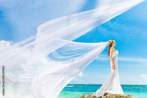 © frolova_elena, Naklejka premium beautiful fiancee in white wedding dress and long white train