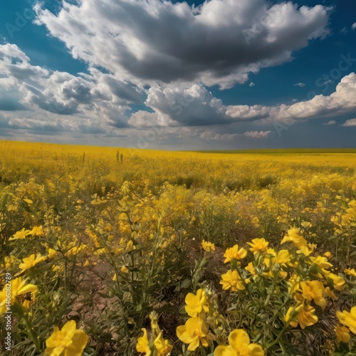 © Hataf, Obraz premium Beautiful field covered with yellow flowers with magnificent clouds in the sky in the