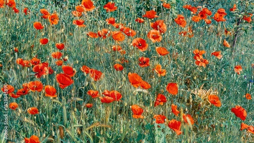 Fototapeta premium Beautiful field filled with bright red poppies in bloom.