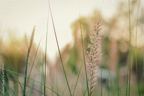 © photo42, Fototapeta premium Beautiful field of grass flowers against blurred sunrise background. Selective focus